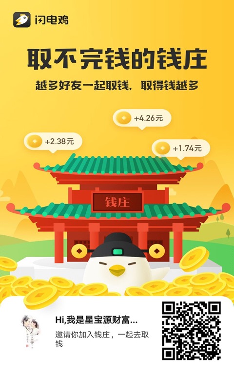 《闪电鸡》,一个超级好玩有趣的平台,给你私人钱庄天天取钱,每天带上闪电鸡自动去探险,购物更便宜,还可以拥有闪电股份持续分红!