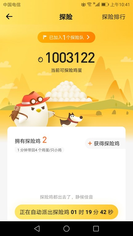 打开左上角,可以看到探险鸡,每天记得带探险鸡自动去探险,带回鸡蛋!
