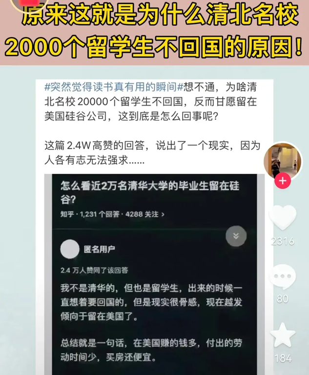 清北名校留学生不回国原因,中国房价超高工资低福利待遇差,35岁不要,美国到点就下班,不会不给加班费。