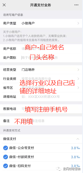 无营业执照的商户请选择小微商户(下图左),有营业执照的商户请选择普通商户(下图右);小微商户的商户名称必须填写为商户_姓名,否则无法通过审核和微信认证,比如商户_张三;普通商户的商户名称必须填写为营业执照名称;商户简称请填写实际店铺门头名称(客户付款成功后会在账单中显示);详细地址填写为实际收款常用地址;客服电话填写负责人的常用手机号,售后专用;备注可不用填写。