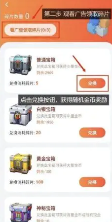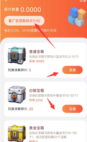 记得碎片兑换相应宝箱,宝箱获得随机金币奖励
