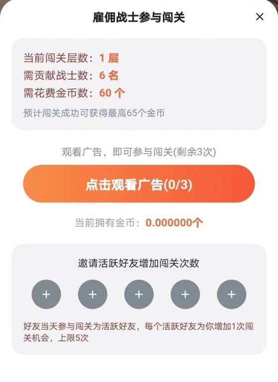 有了足够的战士和金币,才可以往上爬更高一层塔,参与游戏广告分红。