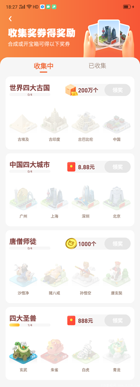 四大古国:古埃及10元,古印度10元,哥伦比亚每日60元(作用:每日多转1次转盘),中国1000元左右(作用:看视频多获得百分之5银B),收集4个可领取200万奖券。