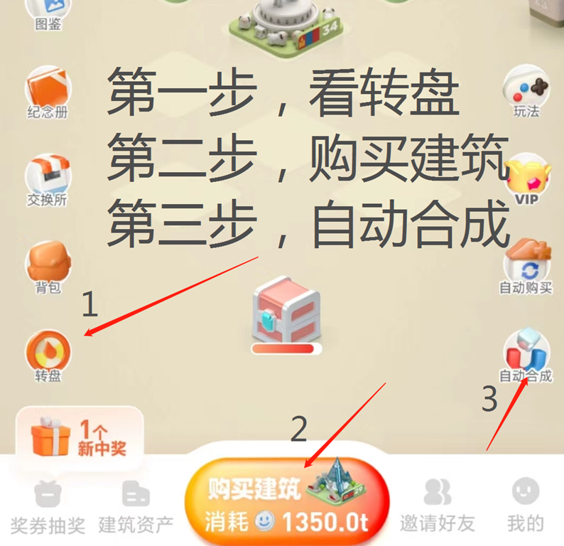 新人刚开始玩最重要的是从零到一的积累,世界金币抽奖是金币来源最为主要的途径,而想增加你获得的金币就得增加你的奖券数量,想要增加奖券产速就要增加手里的建筑数量。所以最简单的方法就是每天合成三十八级建筑产奖券,奖券参与金币抽奖产币,有币了去交换所买建筑复投,产更多的奖券去产币。