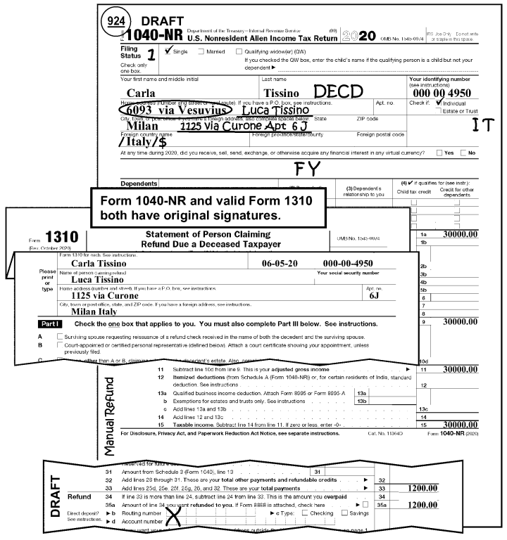 - 支票:如果你没有美国银行账号,或者想收支票,可以把35b-35d空着,国税局就会寄支票到你1040NR表格开头填写的个人地址去。