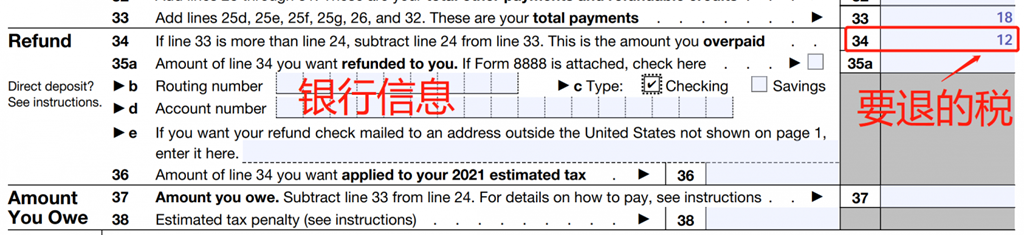 - 银行转帐:35b-35d填写自己的银行账号,IRS会直接ACH转帐给你,VPS大玩家用的是这个接收办法
