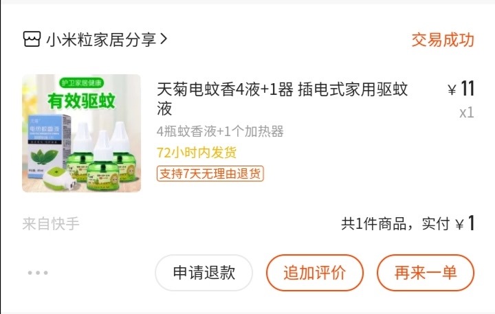 幸福快乐,快手一元钱可以买到夏天用的价值11元电蚊香! 1元购方法扫码注册快手极速版,在左上角选择,进入《快手小店》,新人报道有一元购的大福利包! 大家赶紧去快手领取一元购大礼包吧! 最后收到货后,付款好评,自己出的1元钱可以返回到个人微信账户,相当于白拿!!!