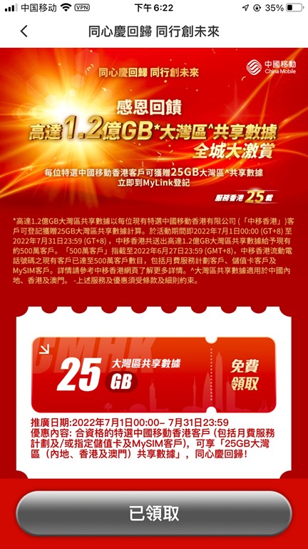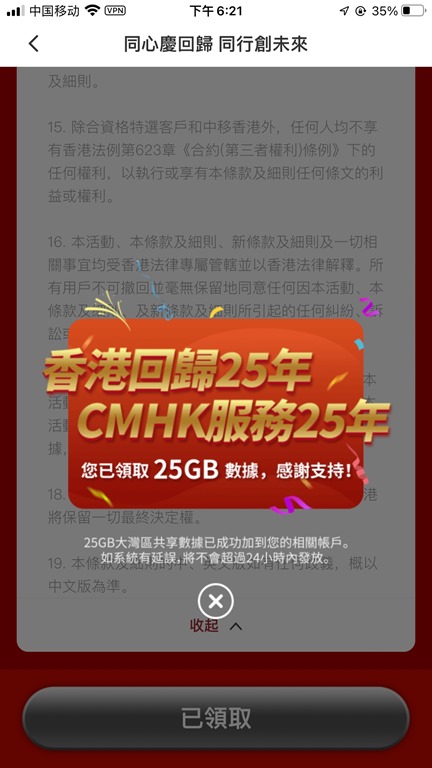 庆香港回归25周年,CMHK香港中国移动送25G流量,有效期从领取当天算起60天,可以在中国内地,香港,澳门两岸三地使用!
