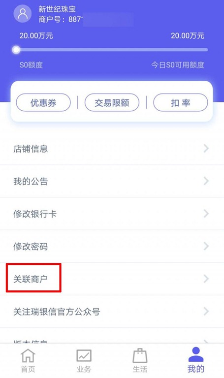 点击“我的”-“关联商户”: