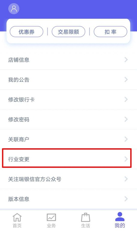 1)点击APP下方选项“”我的 – 选择“行业变更”