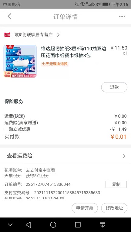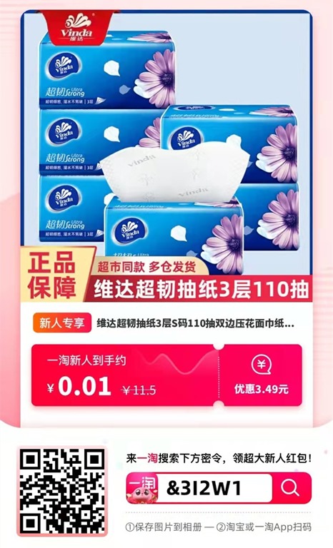 美滋滋 《一淘》一分钱领纸巾 6871F2XxdcVCJ《 https://m.tb.cn/h.f6qJP8M 一淘|官方网购神器,99%商品都减钱,省到怀疑人生! 手机立即扫码,加入一淘,享受一分钱购物超值福利! 1分钱获得抽纸 收货订单详情: