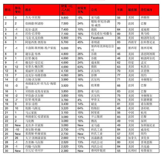 前十名中有7位来自美国。史蒂夫·鲍尔默、阿曼西奥·奥特加和伯纳德·阿诺特财富都增加了200多亿美元。前十名财富总和占全榜单总财富的9%,超过6.7万亿人民币。