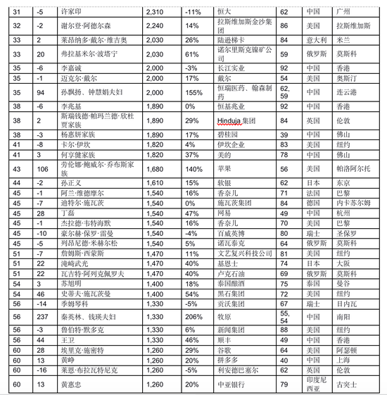 过去一年上升最快:79位个人财富在过去一年里增加了50亿美元或更多,其中中国25位,美国10位,法国5位,印度4位。