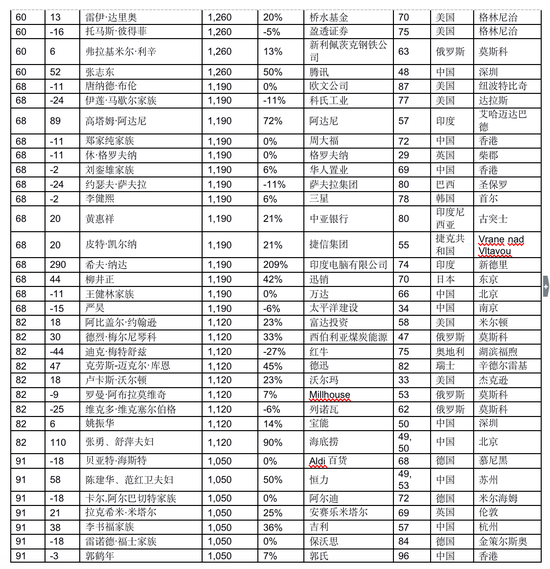 中国:594人财富增长,其中182人是新面孔。107人财富下降,51人落榜。84人财富保持不变。财富显著增加的包括:
