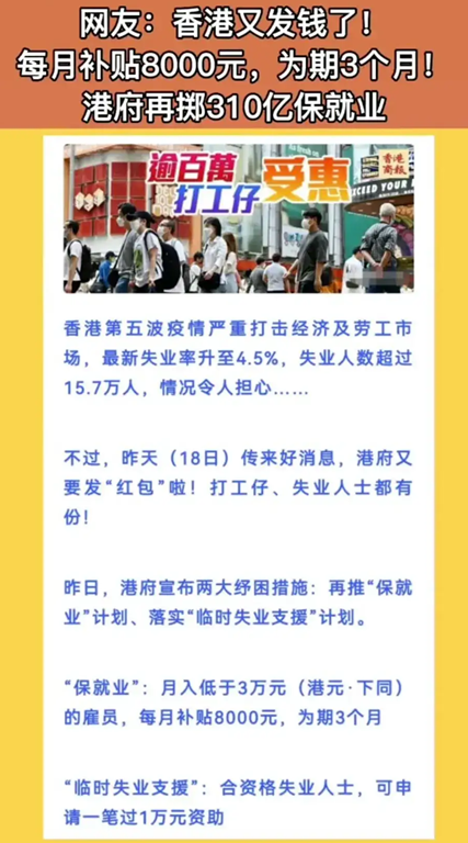 香港又发钱了,月收入低于3万元每月补贴8000元,期限3个月。临时失业支援:合规失业人士,可申请一笔过万元资助。