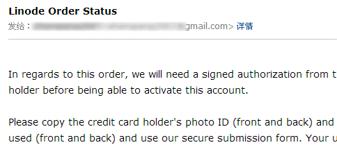 2、收到了Linode VPS要求我验证身份的邮件,邮件中说要上传信用卡的正面和反面照片。