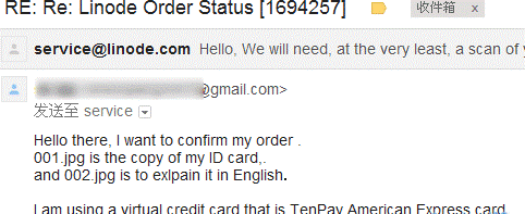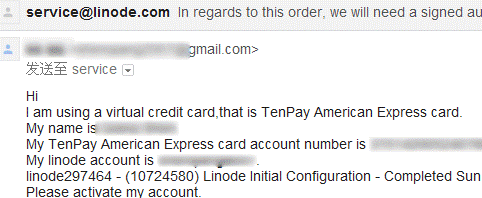 3、由于用的是财付通美国运通卡,虚拟的卡肯定是没有什么正面与反面的,于是我就回了一封邮件给Linode,内容如下: