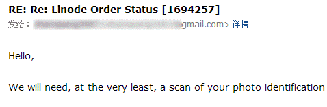 5、回了邮件后,大概十分钟后收到Linode客服发来的邮件,意思是说最起码我要上传一个身份证照片给他们。
