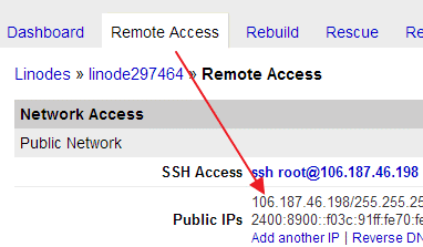 4、Linode VPS IP地址和SSH管理地址可以在”Remote Access”中看到。