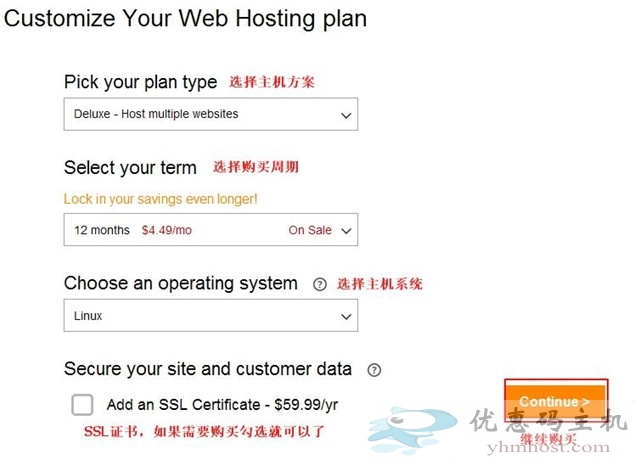 如果你需要同时购买SSL证书的话,这里之间勾选就可以了,价格是59.99美元一年。然后点击”Continue”按钮继续。