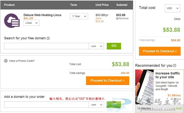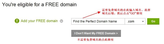 如果你希望注册免费域名的话,在下方的”Add a Domain to your order”下的文本框中输入你要注册的域名,然后点击”GO”按钮开始注册免费域名。
