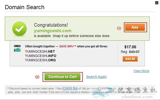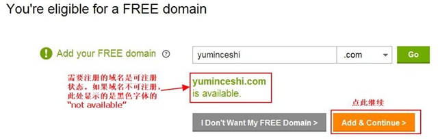 显示域名是可以注册的,所以下方显示绿色的”available”字样,并且显示了”Add & Continue”按钮。如果你输入的域名不可以注册的话,会显示灰色的”not available”字样。