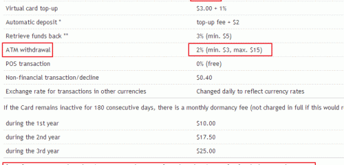 2、再来看一下OKPAY实体卡的费用,从下图可以看出:deposit至少收5美元一次,Retrieve funds back是3% (最少. $5),ATM 取现是2% (最少. $3, 最多. $15)。(点击放大)