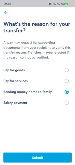 转账原因:汇款给「其他人」需说明原因,应该是法规要求; 可选「向家人汇款」或「工资转账」。 我这次选择的是向家人汇款 (Sending money home to family),直接就入账了。 之前有几次也忘记是选的哪个,被支付宝要求提供申报资金来源性质。 反正Wise提现还是有点玄学的。明明提现到支付宝每年50万的额度还没用完,有时就直接入账了,有时却要求你申报。