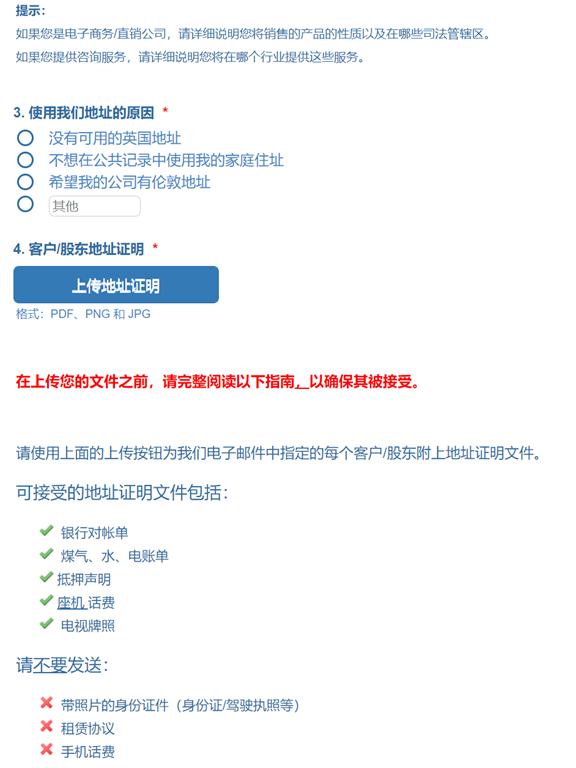 註冊辦公地址可以每年更新,費用為 39.00 英鎊加增值稅。服務地址可以續訂,費用為 26.00 英鎊加增值稅,公司地址為 96.00 英鎊加增值稅。